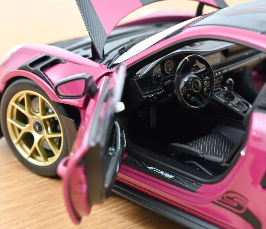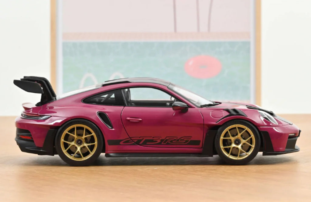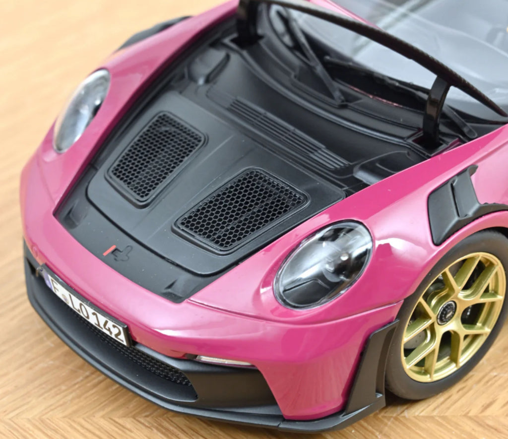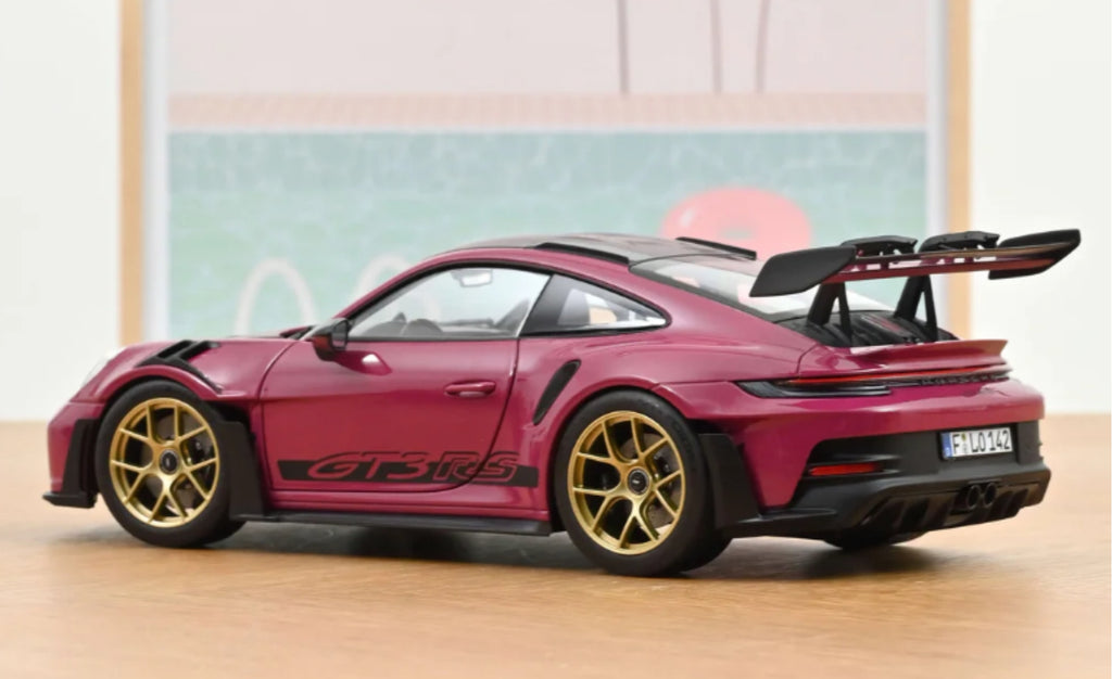 Norev highly detailed Porsche 911 GT3 RS in 1/18 scale impresses with its excellent workmanship and attention to detail. The opening parts include doors and boot lid, which allow a view of the finely crafted interior and the detailed boot with cooling air ducting. Particularly noteworthy are the grilles made from photo-etched parts, which give the model a realistic look. The paintwork in eye-catching ruby star with colored accents and golden rims round off the elegant and sporty appearance.